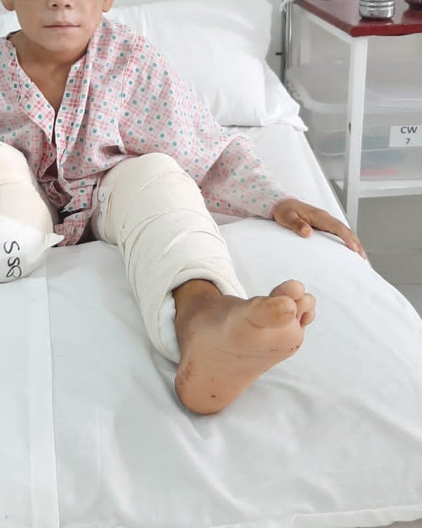 Malang ha 8 anni. A causa delle ferite molto gravi, abbiamo dovuto amputare la sua gamba destra, sotto al ginocchio.